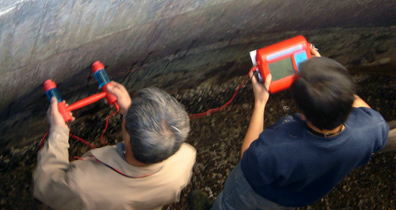 ? ? 渦流探測法是將電磁設備放在混凝土構件上,電磁裝置發射出的勵磁電流與鋼筋內的次聲波諧振,通過觀察磁飽和后,銹蝕鋼筋引起的電磁場圖像異常,通過數據換算來確定鋼筋截面積的損失率。