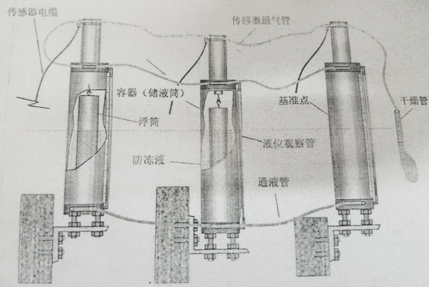 在多點系統中,所有傳感器的垂直位移均是相對于其中任意一點(這一點又叫基準點或參照點)的變化,該點的垂直位移應是相對穩定的或者是可用其他人工觀測手段來確定,以便能精確計算靜力水準系統各測點的沉降變化。此外,還可以通過每臺儀器上的液位觀察管來粗略查看水位的變化。