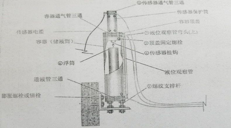 將配套用于容器蓋頂的“O”型密封膠圈裝入容器頂蓋預留的凹槽中(防止容器內液體氣化揮發),找出與傳感器編號一致的浮筒,將浮筒上的污漬擦拭干凈。將浮筒掛鉤掛在傳感器掛鉤上,握住傳感器保護筒部分,通過容器頂蓋螺絲孔及液位觀察管彎頭,將容器頂蓋與容器對正,將浮筒輕緩放入容器內,緩慢壓入容器頂蓋(掛上浮筒后應避免浮筒與傳感器部分發生扭轉,操作時動作應輕緩,避免損壞傳感器),擰上頂蓋固定螺絲并將液位觀察管恢復原狀(靜止5分鐘,此時還可以用特定讀數儀GK403等測試傳感器的安裝讀數情況)。