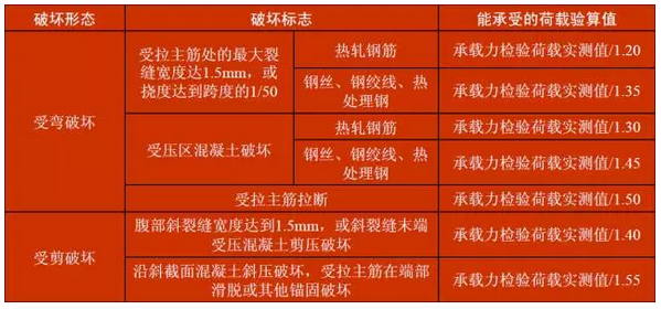 當在規定的荷載持續時間內出現下表的破壞標志之一時,說明構件不能滿足承載力要求,應取本級荷載值與前一級荷載值的平均值作為其承載力檢驗荷載的實測值,并根據表中建議的方法推算構件在目標使用期內能夠承受的荷載驗算值。
