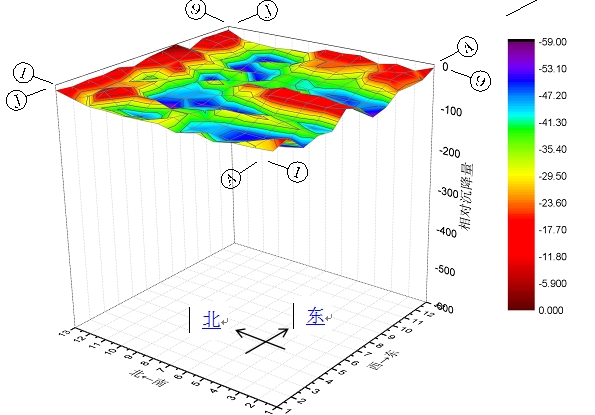 從圖中可以看出,地坪發生相對不均勻沉降且無明顯規律,總體表現為北端、南端角部及南端中部地坪相對不均勻沉降較小,其余位置處相對不均勻沉降較大。其中相對不均勻沉降量最小值即相對零沉降點位于最東側(即8軸)中部偏南位置處,相對不均勻沉降量最大值為59mm,該沉降點位于地坪西北角2~3-F~G軸跨中位置處。