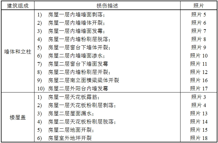 部分承重墻開裂為結構性損傷,部分承重磚墻破損,將造成局部豎向構件承載力降低,會對房屋結構造成一定的安全隱患。部分區域外墻開裂、面粉刷剝落將會影響房屋結構的耐久性。