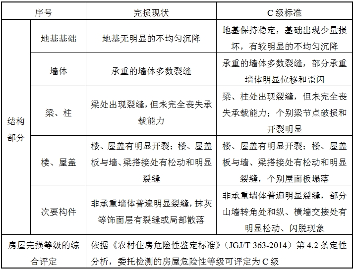 根據現場檢測結果,按照國家標準《農村住房危險性鑒定標準》(JGJ/T 363-2014)第3.2條的評定方法,對房屋危險性進行定性評定。