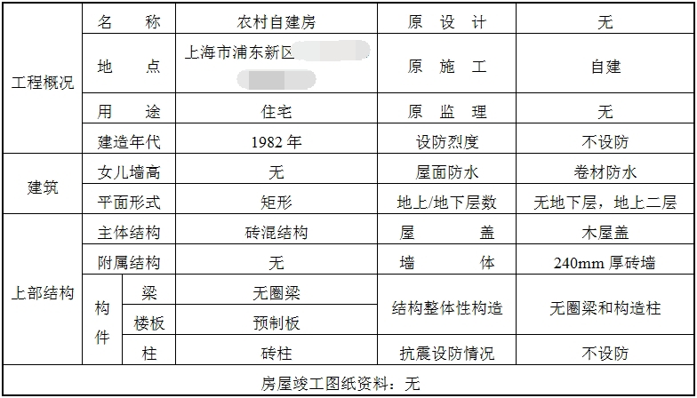 上海市浦東***村**組**號農村住宅為一幢二層磚混結構房屋,建造于1982年。現業主***擬對房屋進行修繕和維護,為了解房屋完損情況,由上海同瑞建筑結構設計事務所有限公司委托房屋質量檢測站對上述房屋進行完損狀況檢測,并對可能存在的問題提出處理建議。