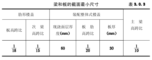次梁間距小于或等于2m/板厚大于或等于80mm的肋形樓蓋和預制槽板寬度小于或等于1.2m的裝配整體式樓蓋,其梁和板的截面最小尺寸,應符合表3.0.3的規定。